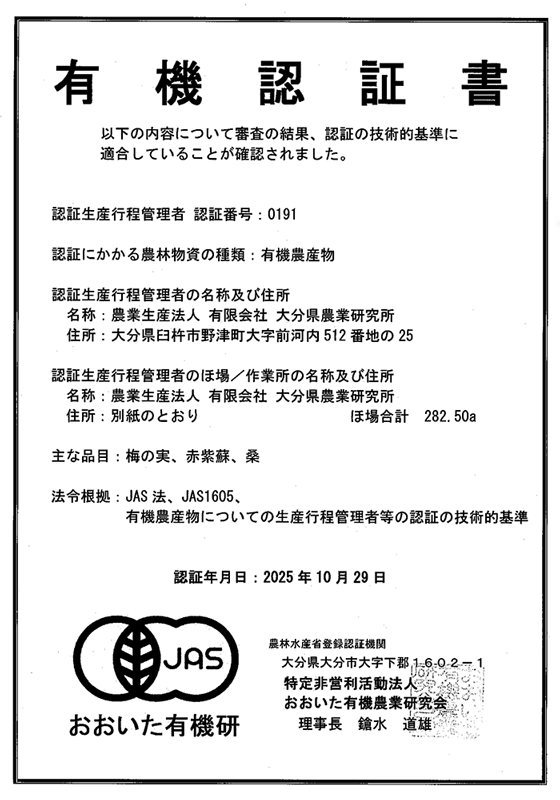 3年間の日報の提出や土壌の調査などを受け、この秋、大分農研の農地が『有機JAS』認定されました!