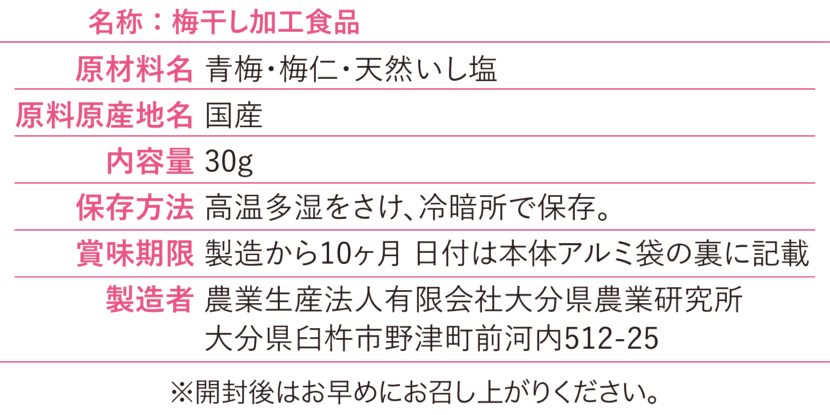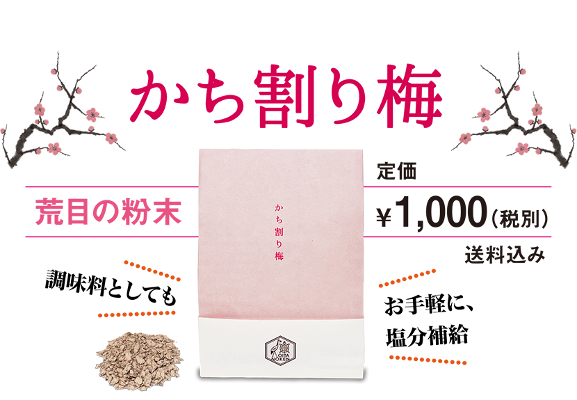 かち割り梅 ¥1,000(税別) 青梅(梅肉,梅仁)の栄養成分を 丸ごと濃縮した健康食品『かち割り梅』 栄養素成分を損なわぬよう化学肥料を使わず、 昔ながらの作業で栽培しています。 ミニ健祥爽喜 ¥2,000(税別) Made in 大分農研 リストMade in 大分農研 リスト 健祥爽喜-粒 ¥12,000(税別) 健祥爽喜-粉末 ¥12,000(税別) ミニ健祥爽喜 ¥2,000(税別)